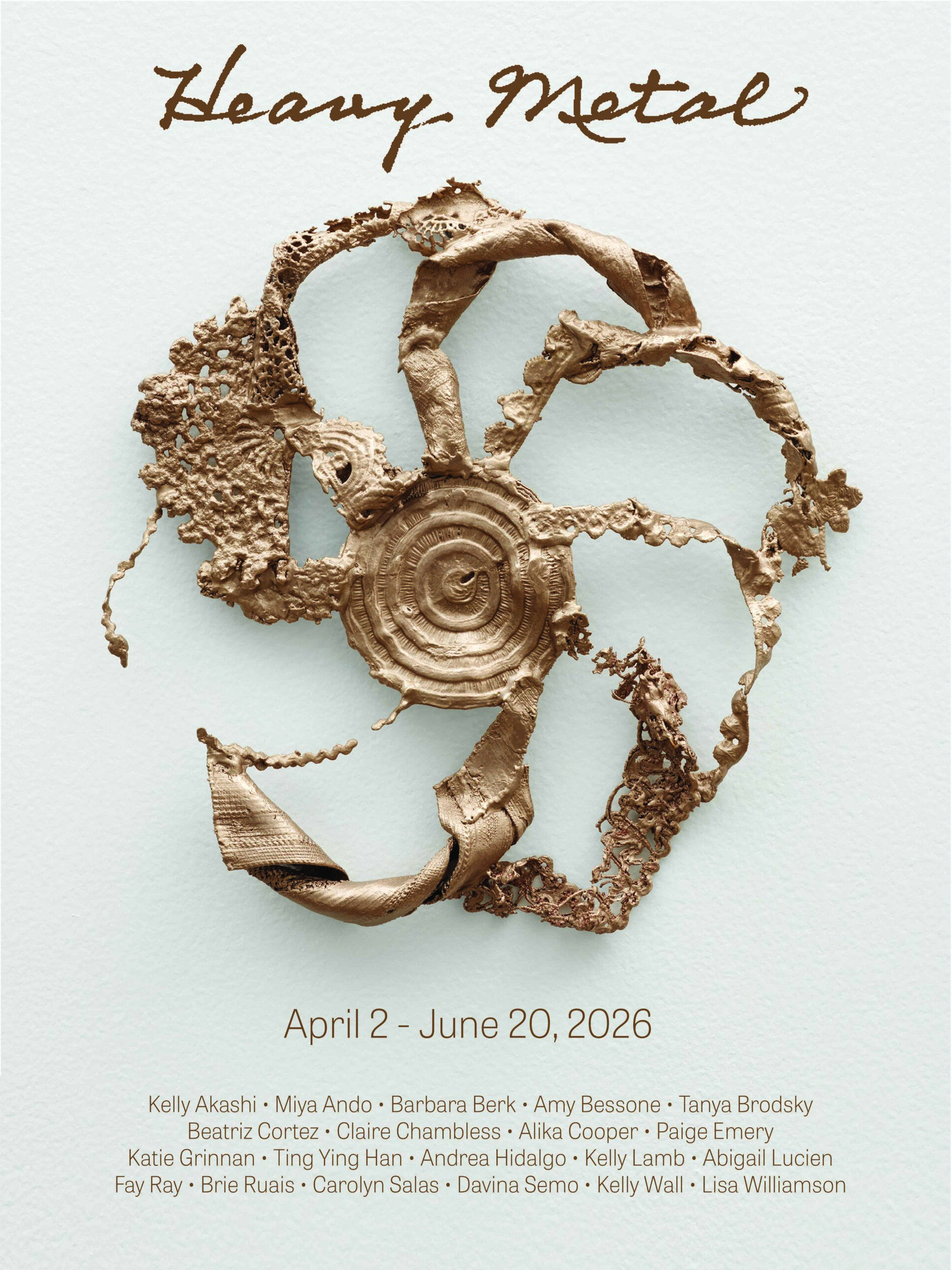 Heavy Metal is curated by LAMAG curator, Nancy Meyer and includes works by Kelly Akashi, Miya Ando, Barbara Berk, Amy Bessone, Tanya Brodsky, Beatriz Cortez, Claire Chambless, Alika Cooper, Paige Emery, Katie Grinnan, Ting Ying Han, Andrea Hidalgo, Kelly Lamb, Abigail Lucien, Fay Ray, Brie Ruais, Carolyn Salas, Davina Semo, Kelly Wall, and Lisa Williamson.